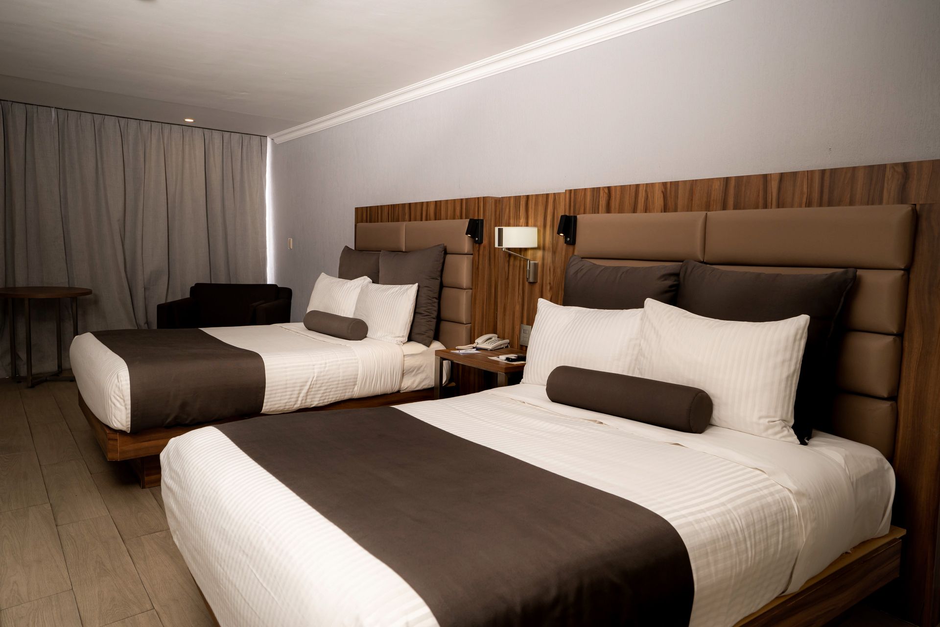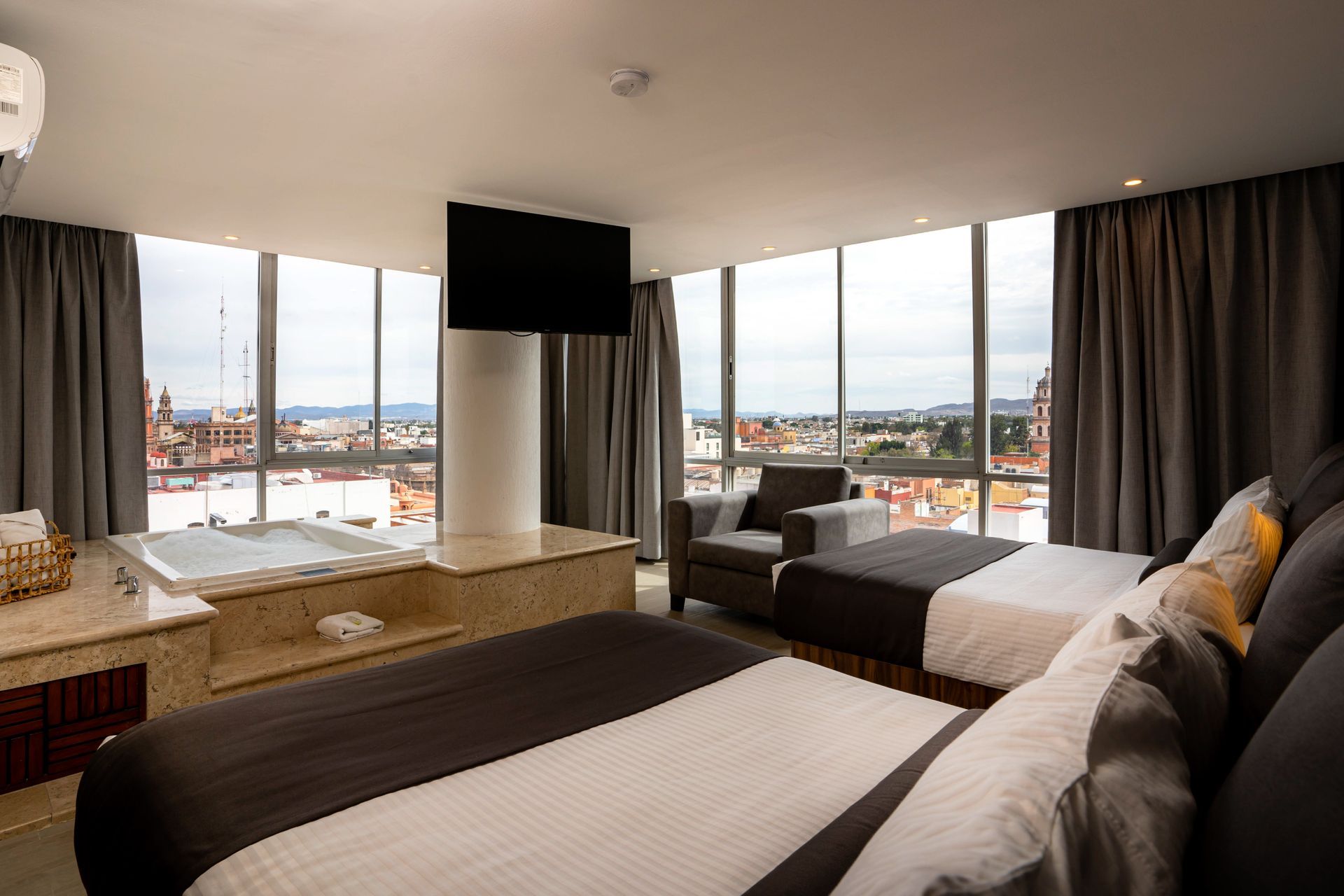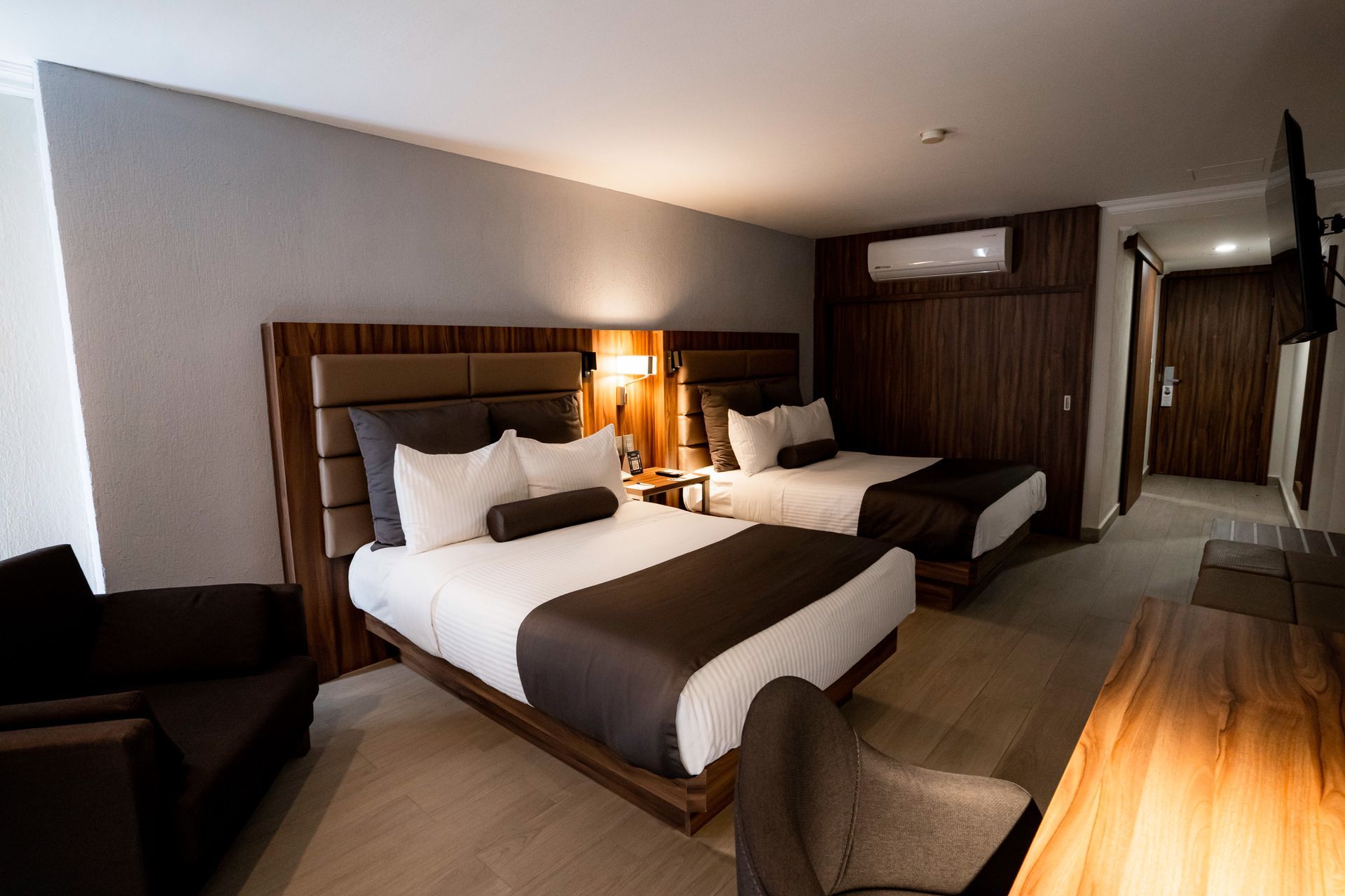 Habitación con dos camas matrimoniales con mayor espacio y comodidad, con estancia y dos baños. Una de las mejores vistas de la ciudad, la estancia cuenta con baño completo sala de estar, con televisión, aire acondicionado, horno de microondas y frigobar. Excelente para familias o ejecutivos de negocios que quieren tener reuniones de negocios exclusivas.