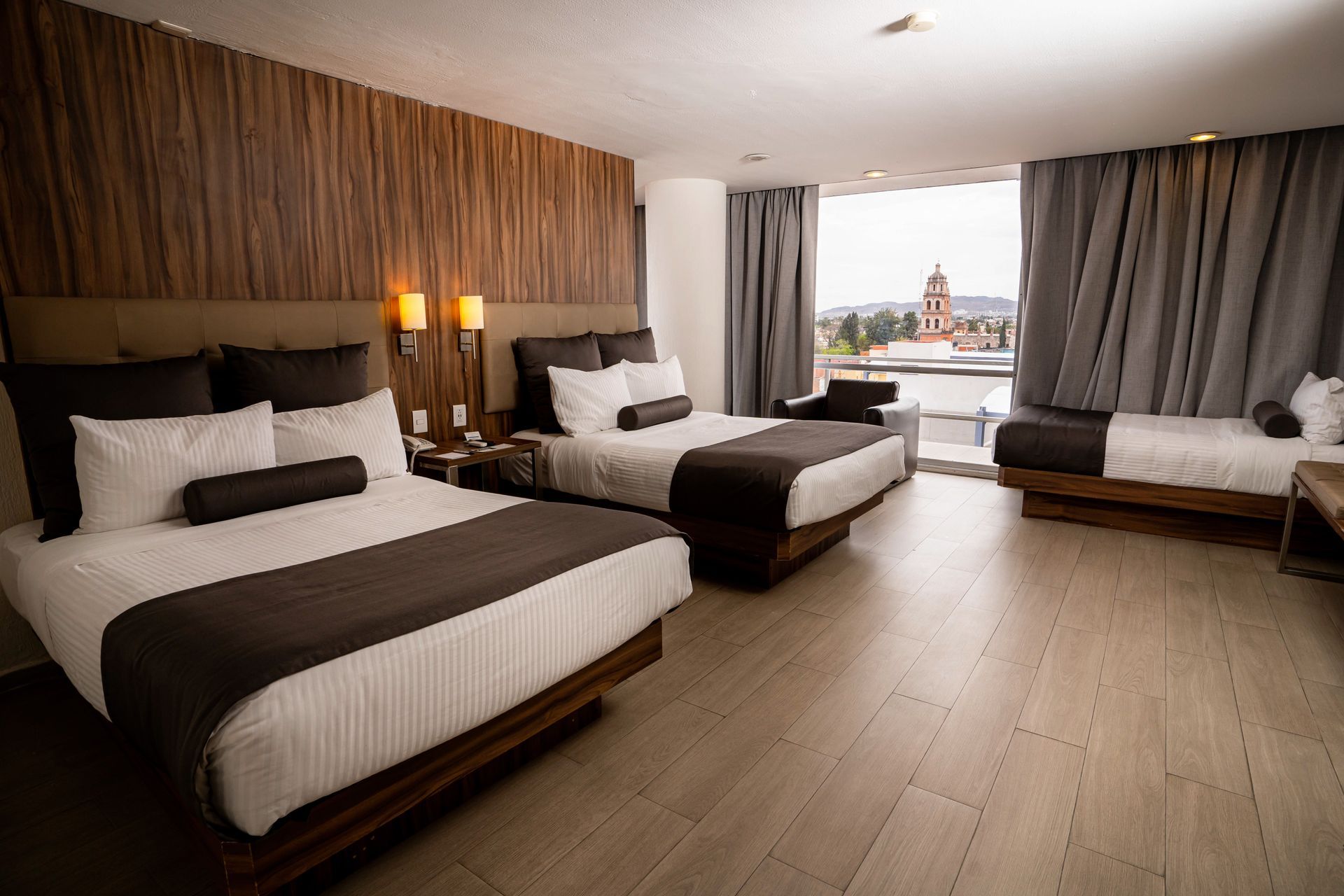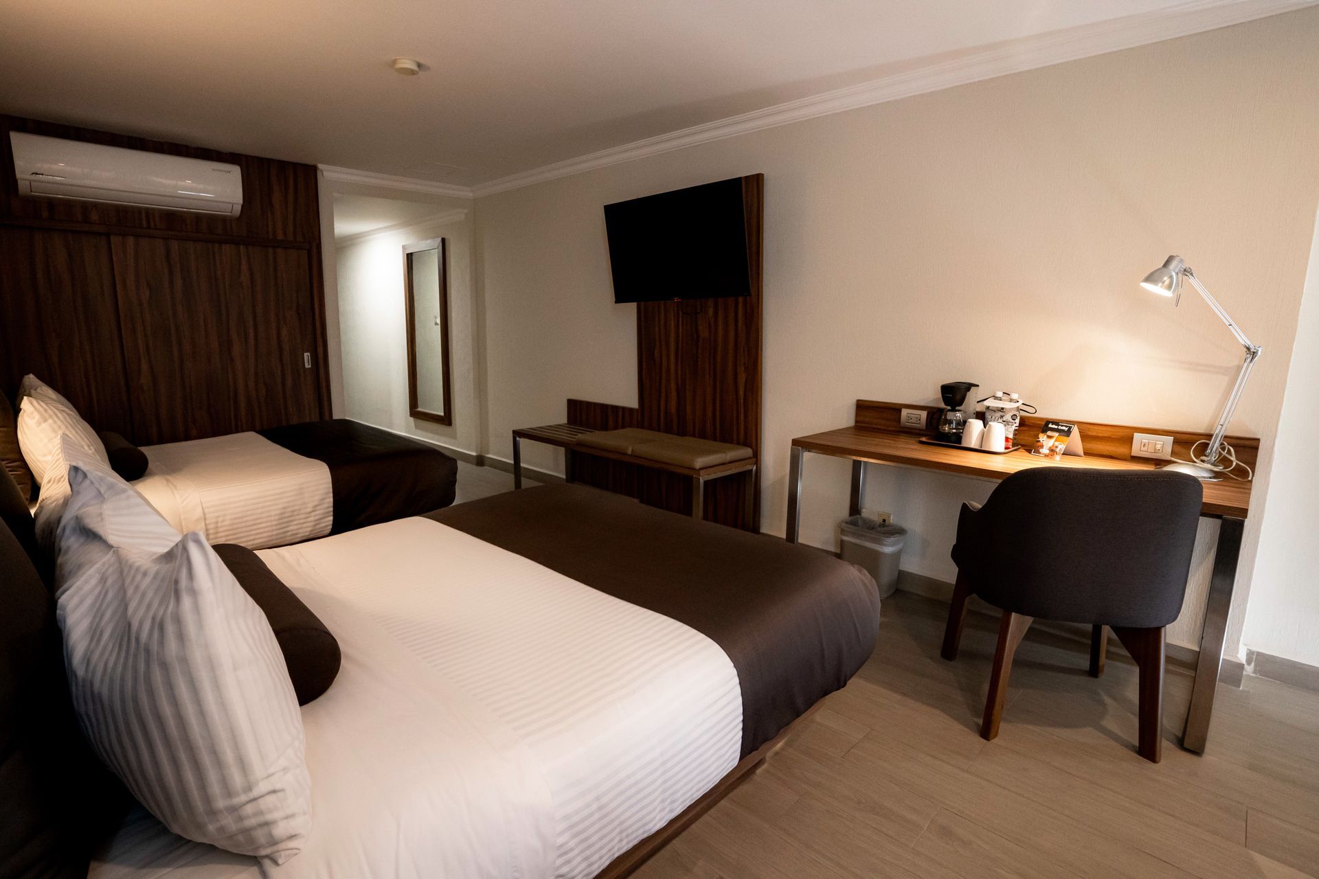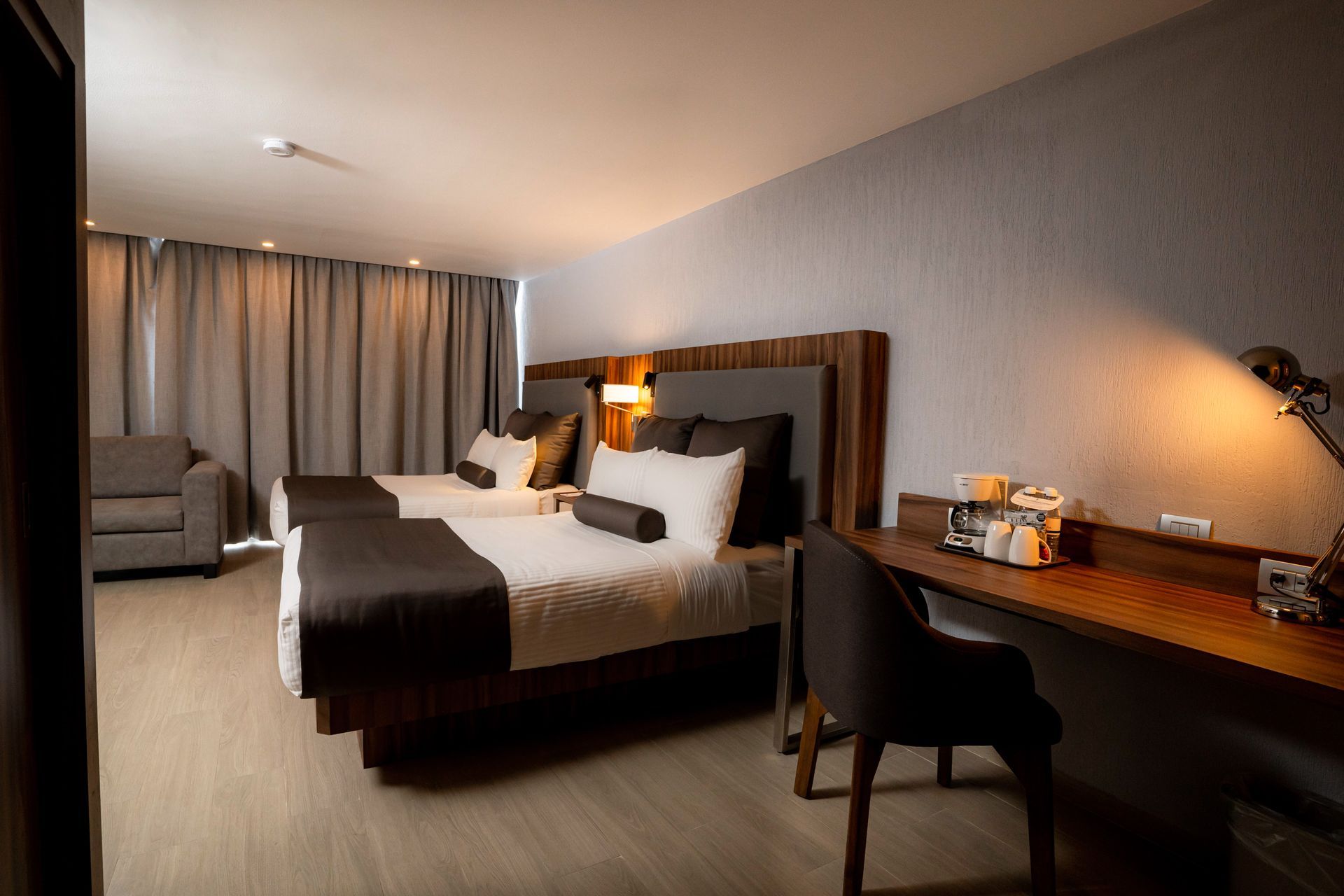 Habitación con dos camas matrimoniales con mayor espacio y comodidad, con estancia y dos baños. Una de las mejores vistas de la ciudad, la estancia cuenta con baño completo sala de estar, con televisión, aire acondicionado, horno de microondas y frigobar. Excelente para familias o ejecutivos de negocios que quieren tener reuniones de negocios exclusivas.