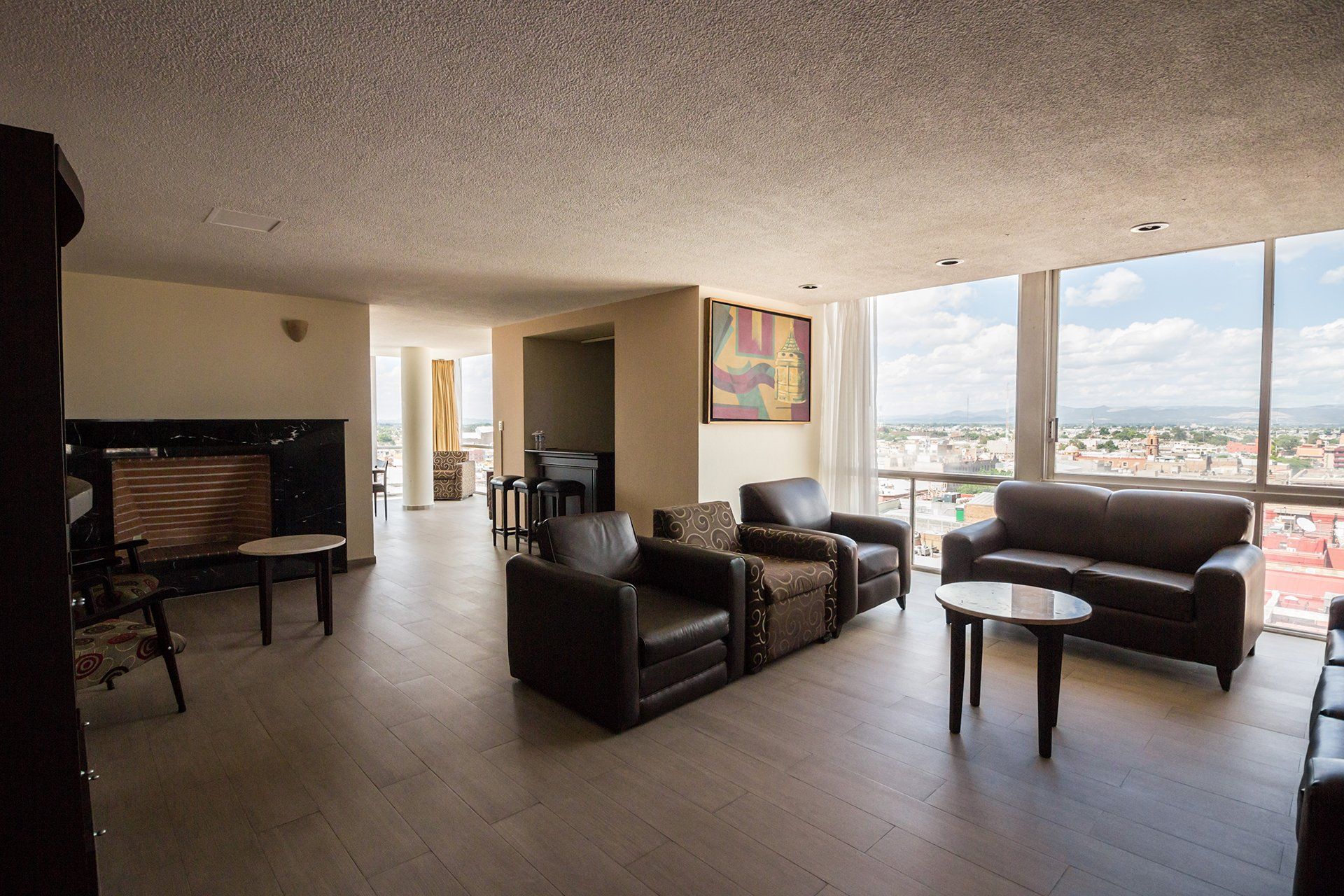 Ubicada en el 9° piso con una excelente vista panorámica de la ciudad desde tres diferentes ángulos. Tiene sala equipada con frigobar, televisión, aire acondicionado y medio baño, así como comedor con mesa para 8 personas. Cuenta con dos habitaciones independientes con baño cada una, aire acondicionado, televisión y balcón. Habitación ideal para familias, tratos empresariales donde necesiten lugar espacioso e independiente para tratar negocios, largas estancias, arreglo de novias con sus damas y familia.