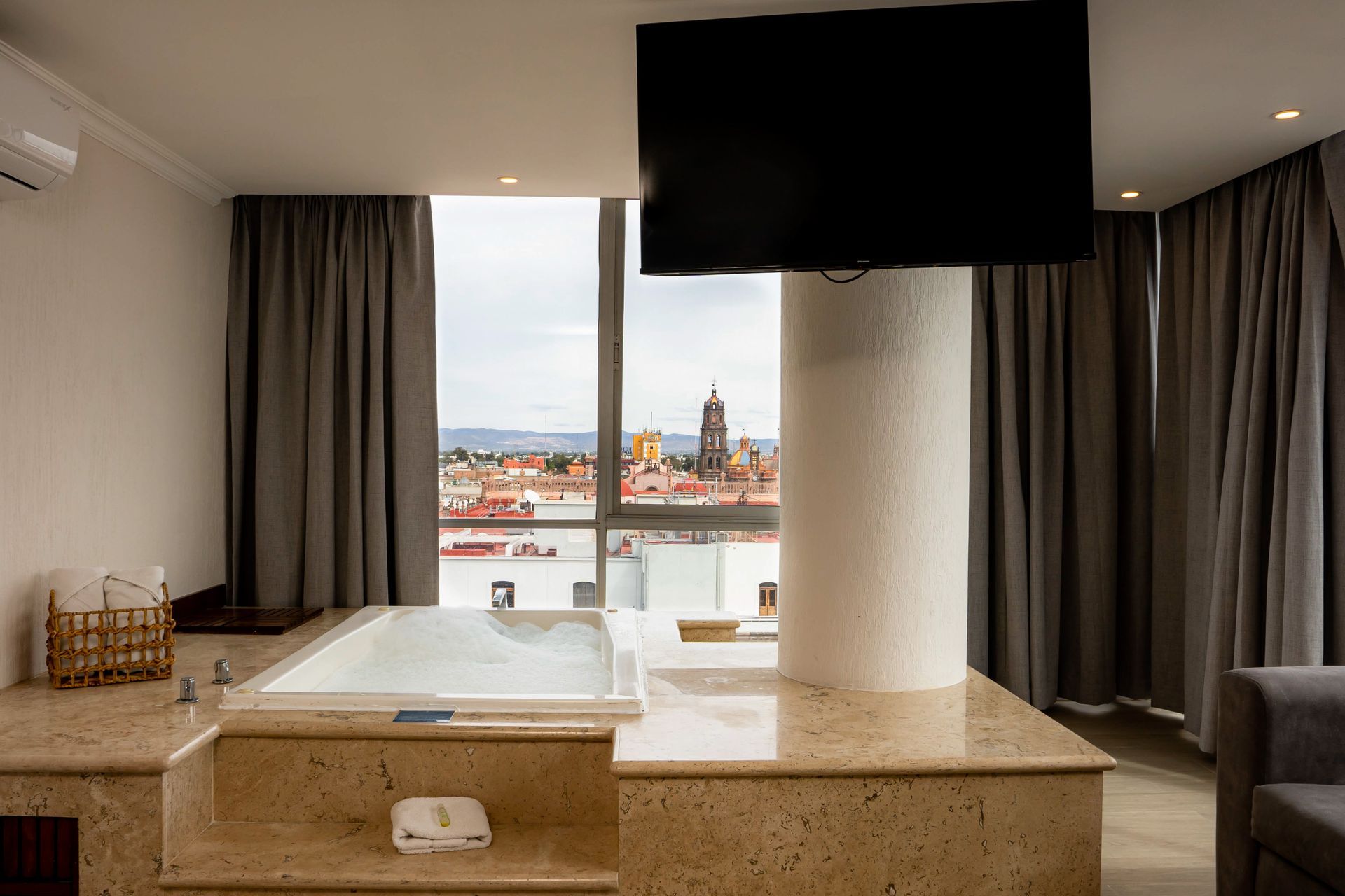 Habitación con una cama king con mayor espacio y comodidad, en la alcoba tiene jacuzzi con vista a la ciudad, y baño independiente. La estancia cuenta con baño completo sala de estar, con televisión, aire acondicionado, horno de microondas y frigobar. Una excelente opción para tener una velada romántica con nuestros paquetes nupciales.